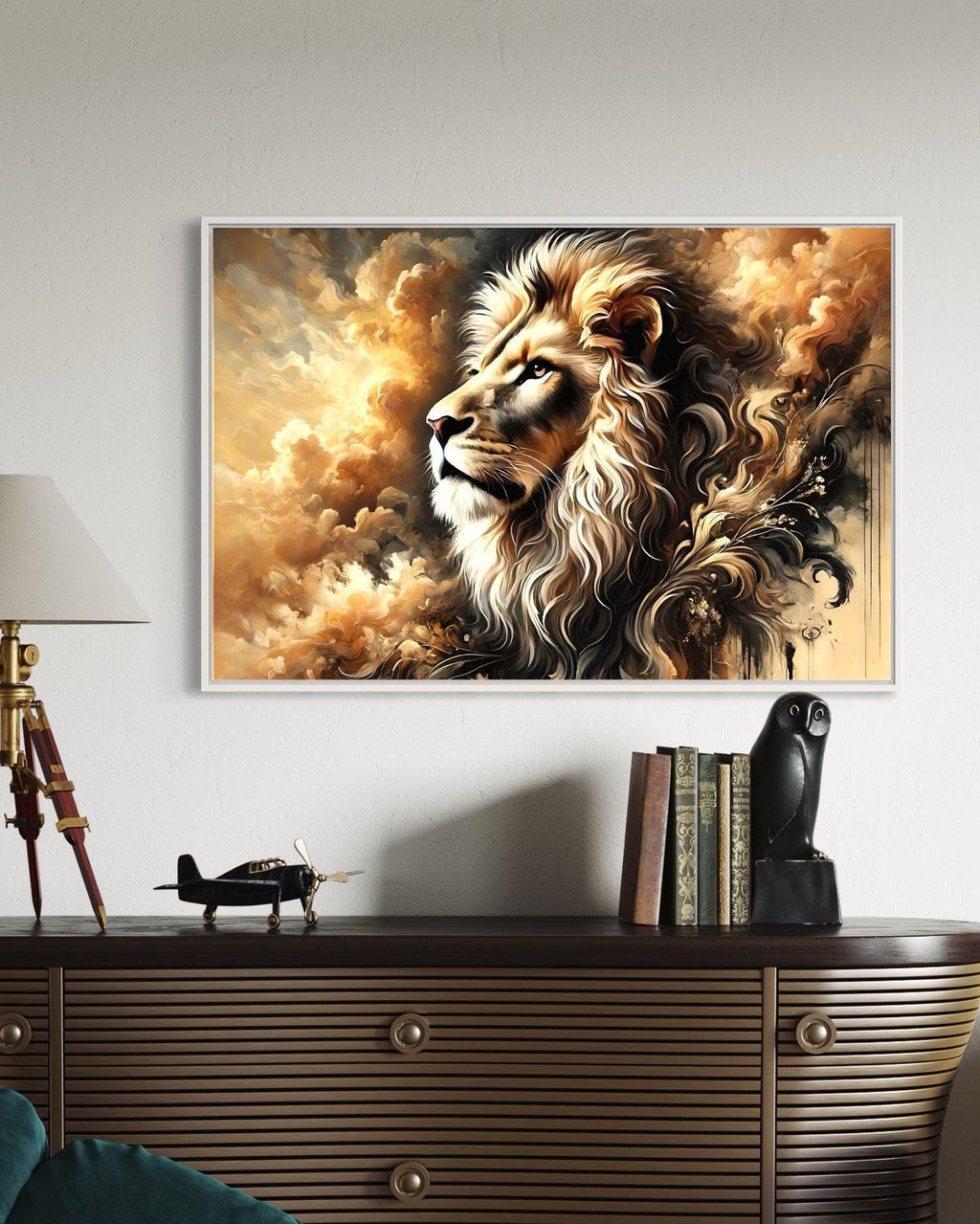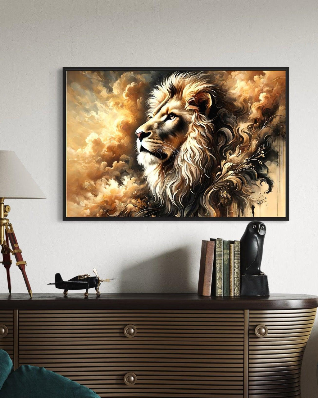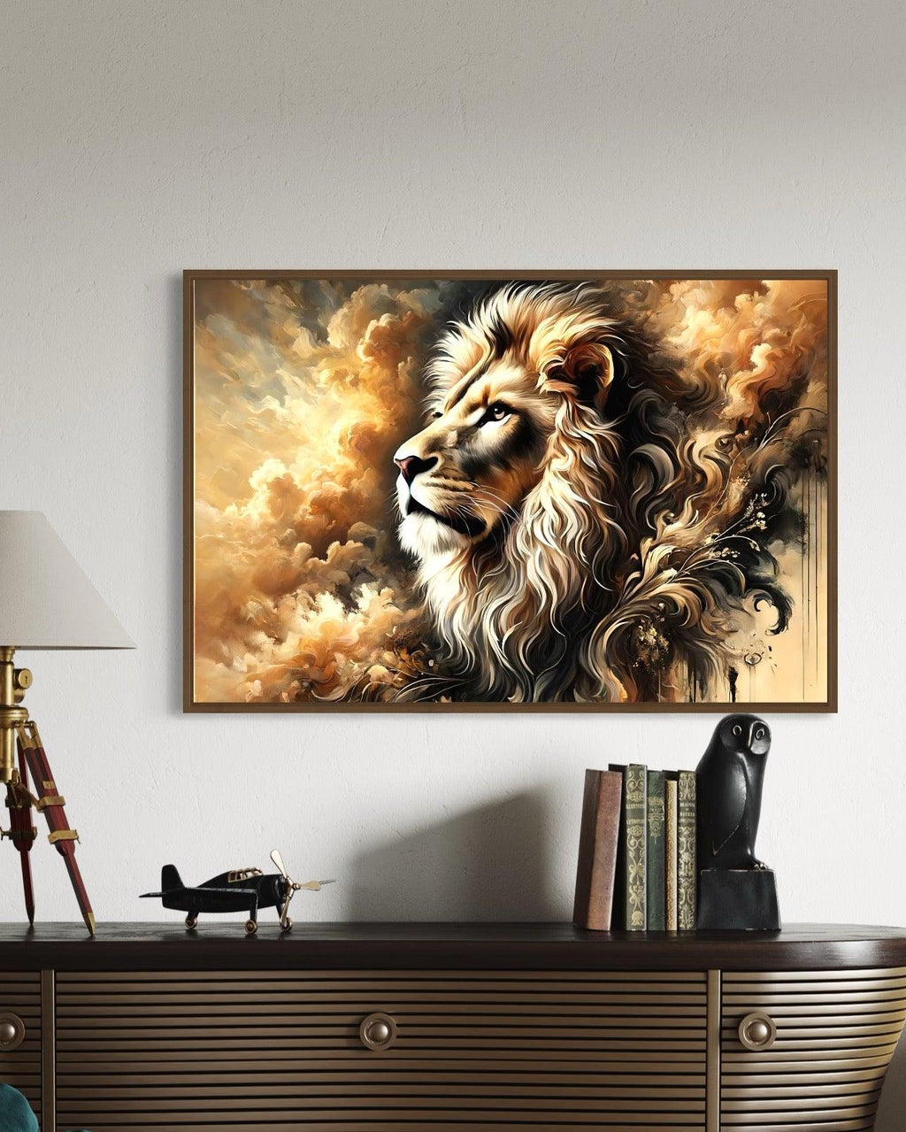 O leão é retratado com uma majestade imponente, sua juba esvoaçante em tons dourados e marrons, envolta em nuvens que parecem emanar sua força e poder. As cores quentes e ricas criam um contraste dramático que atrai imediatamente o olhar e transmite uma sensação de respeito e admiração.
