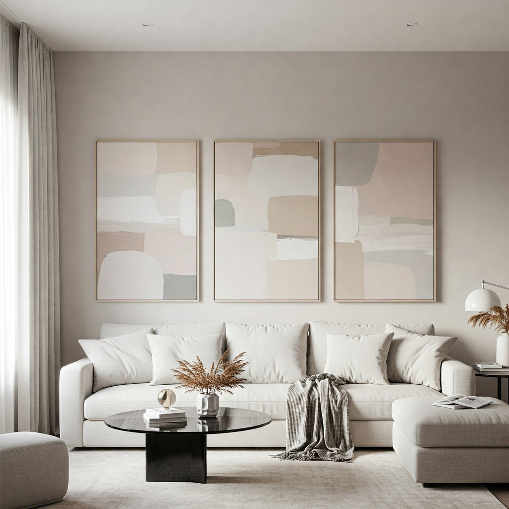O Trio Essência Natural traduz a harmonia entre formas orgânicas e tons terrosos, criando uma atmosfera de sofisticação e equilíbrio. Com pinceladas suaves e um design abstrato moderno, essa composição traz a leveza dos tons neutros – bege, areia, cinza-claro e suaves toques de verde – que remetem à natureza e ao minimalismo contemporâneo.
