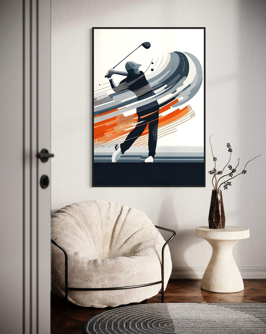 "Golf Swing" é uma obra que captura a força e a precisão do momento exato em que o jogador faz sua tacada. Com uma paleta de cores modernas que alterna entre tons de cinza, preto e laranja, esta peça transmite o dinamismo e a energia do golfe de uma maneira única.