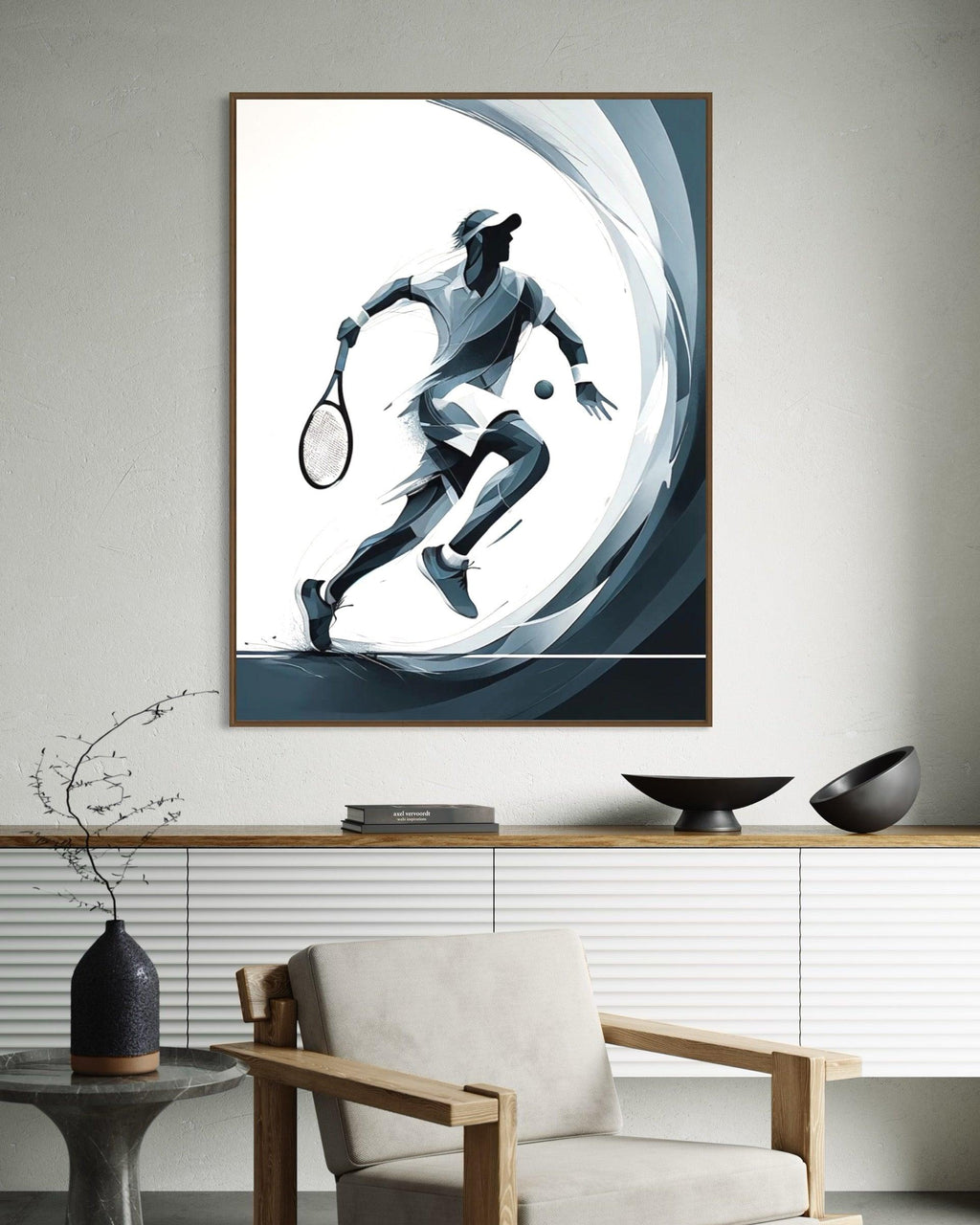 A escolha dos tons monocromáticos em azul e cinza enfatiza a elegância e a simplicidade, enquanto o design minimalista permite que o foco seja totalmente voltado para a ação retratada. Cada detalhe, desde a postura atlética até o movimento da raquete, é capturado com uma clareza que transmite tanto a intensidade da competição quanto a beleza do movimento humano.