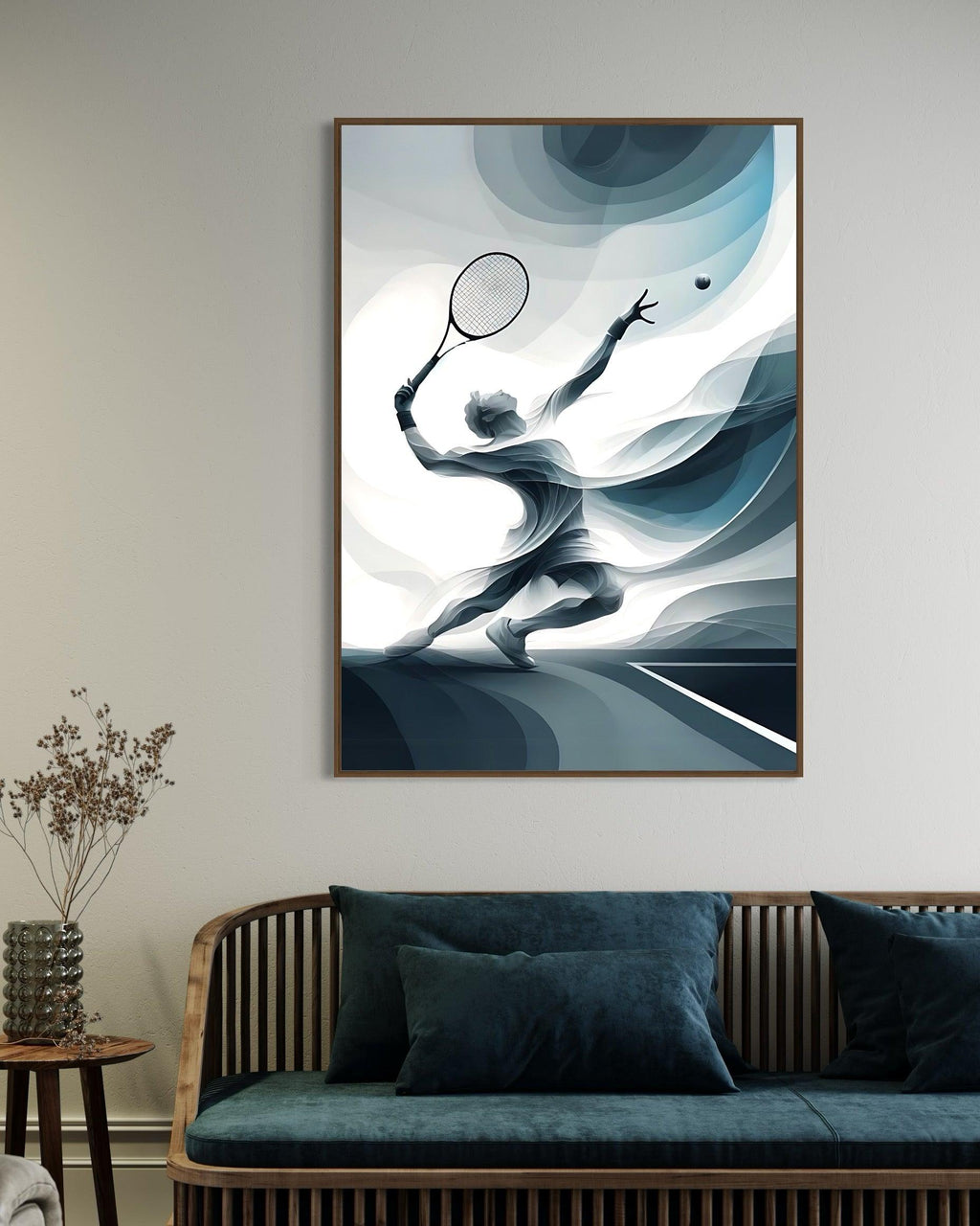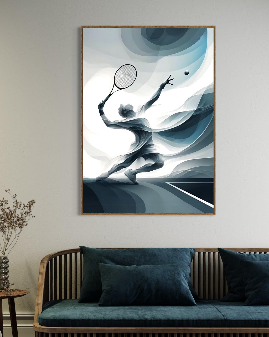 A paleta de cores, composta por tons de azul e cinza, traz uma sensação de serenidade e poder, enquanto as formas onduladas que compõem o fundo criam uma atmosfera de leveza e continuidade. A raquete levantada, pronta para o saque, simboliza o equilíbrio perfeito entre técnica e inspiração, o que torna esta peça uma representação do foco e da determinação necessários em cada partida.