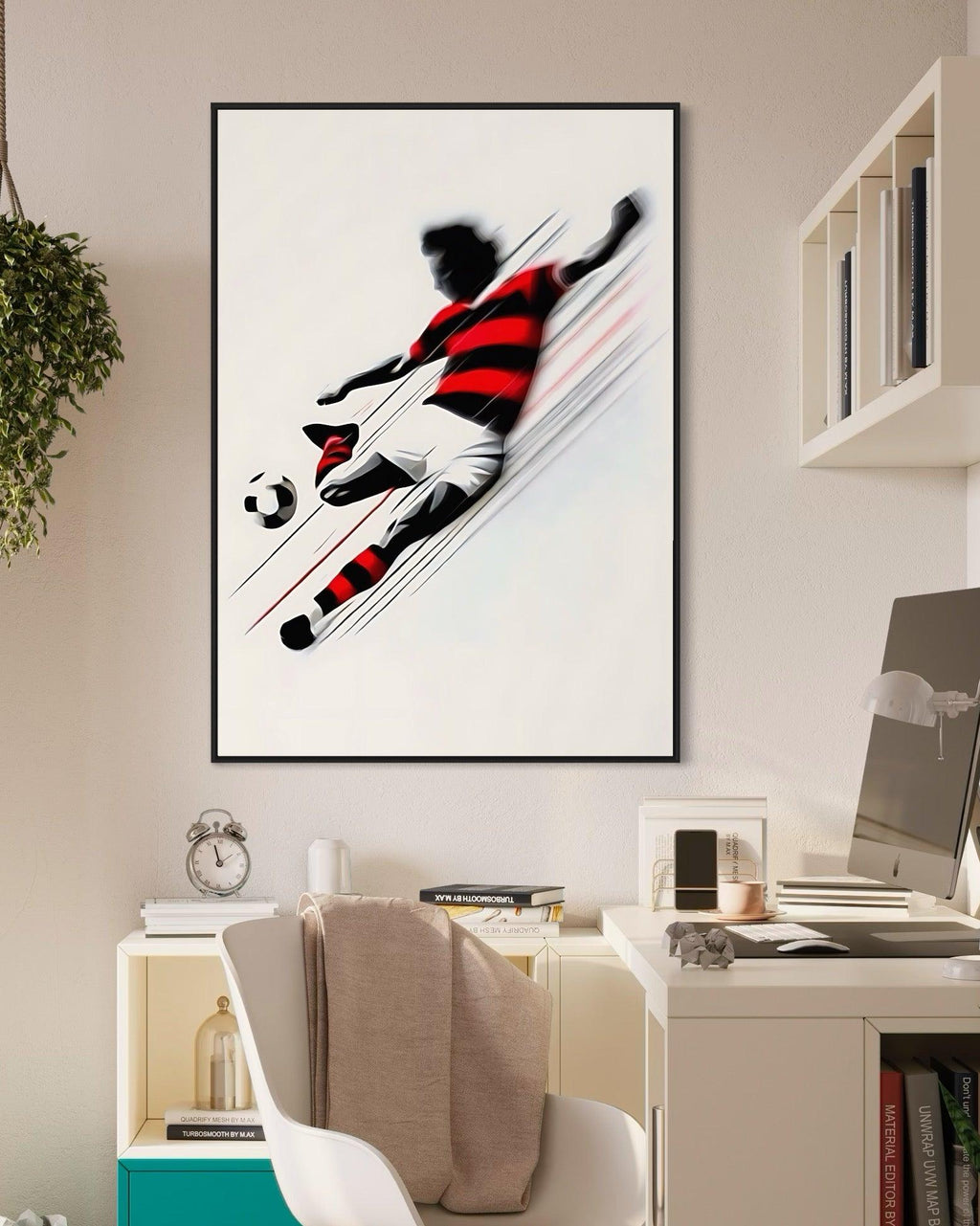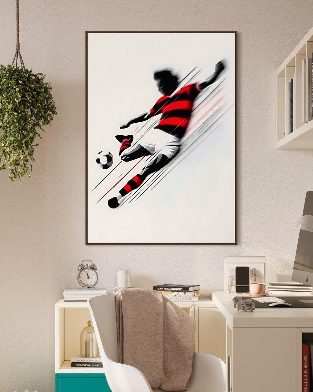 Este quadro captura a essência do Flamengo em ação, com uma abordagem artística moderna que destaca a energia e paixão do futebol. As cores icônicas do rubro-negro são apresentadas de forma dinâmica, com o jogador em movimento, simbolizando a força e determinação que caracterizam o clube. A técnica utilizada oferece um efeito de velocidade e intensidade, tornando esta peça uma homenagem perfeita ao Flamengo, ideal para quem deseja trazer um toque de elegância e paixão ao ambiente. É uma peça que não apenas representa o amor pelo futebol, mas também se destaca como uma obra de arte sofisticada.