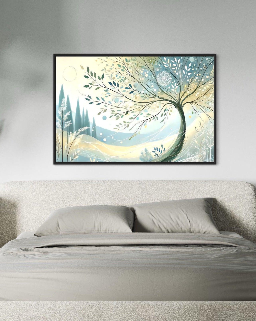 A composição fluida e orgânica deste quadro é ideal para ambientes que buscam incorporar elementos naturais de forma elegante e discreta. A leveza das folhas e a curva delicada do tronco da árvore criam um movimento visual que guia o olhar do espectador, proporcionando uma experiência contemplativa e relaxante.