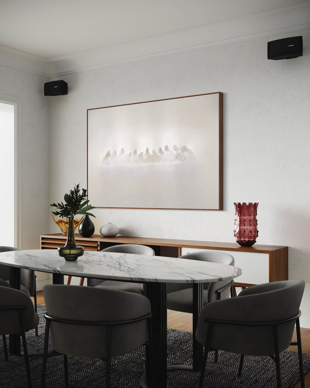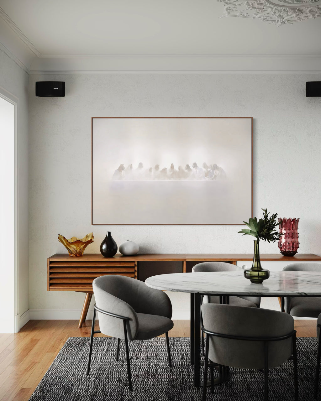 “Ceia da Luz” é uma obra que traduz espiritualidade e serenidade em uma estética contemporânea e minimalista. A releitura sutil da icônica Última Ceia convida à introspecção e ao diálogo silencioso com o ambiente. Sua paleta neutra em tons esfumados de branco e cinza cria uma sensação de leveza e sofisticação, perfeita para ambientes de convívio como salas de jantar. Esta peça harmoniza com espaços elegantes, apostando na suavidade visual para complementar o mobiliário moderno sem competir com ele. Ideal para quem busca arte com significado e presença sutil.