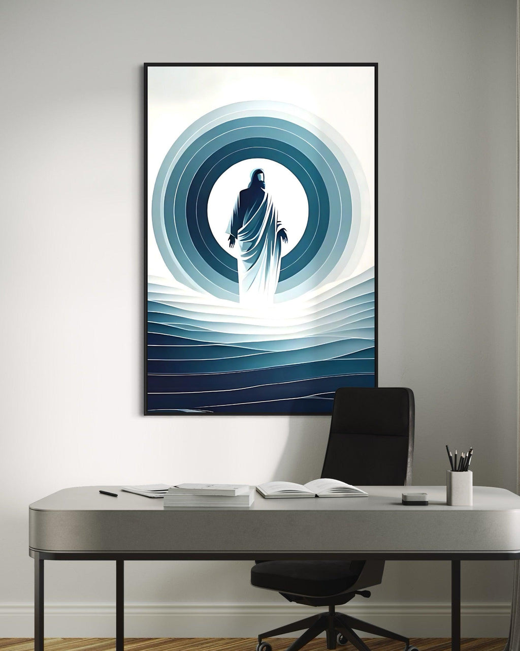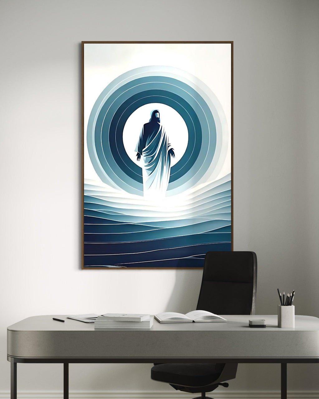 A simplicidade das linhas e a escolha cuidadosa das tonalidades de azul e branco criam uma sensação de profundidade e serenidade, evocando a presença celestial de Cristo. A imagem central, emoldurada por formas que sugerem tanto o céu quanto o caminho espiritual, atrai o observador para uma reflexão profunda e pessoal.