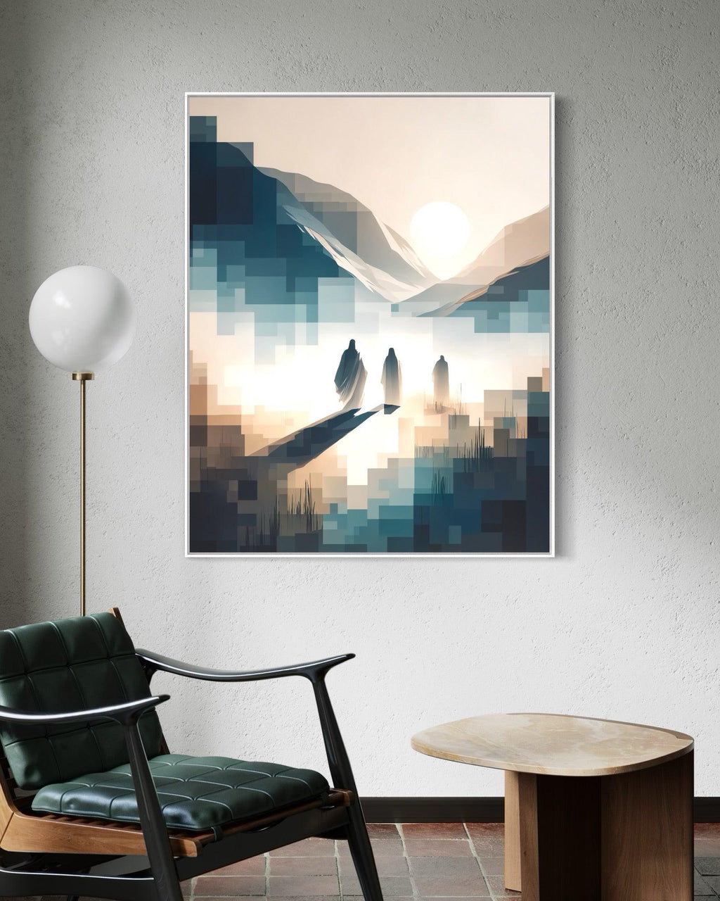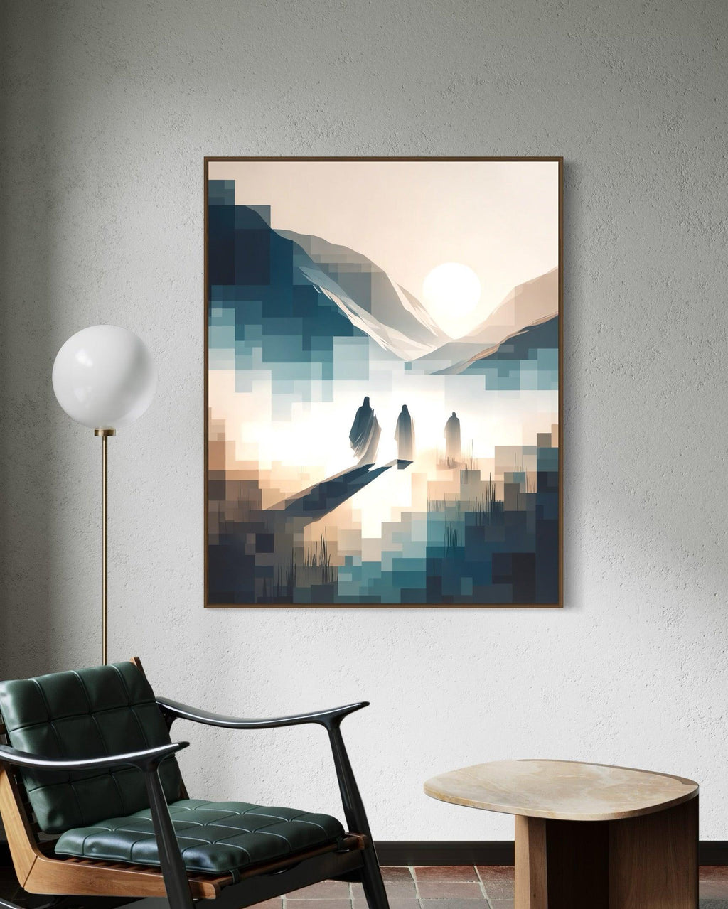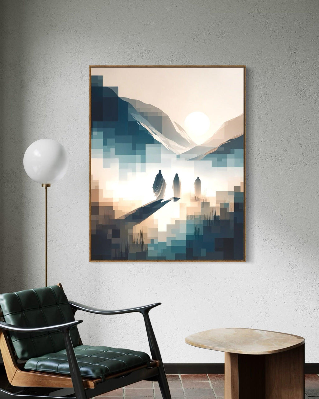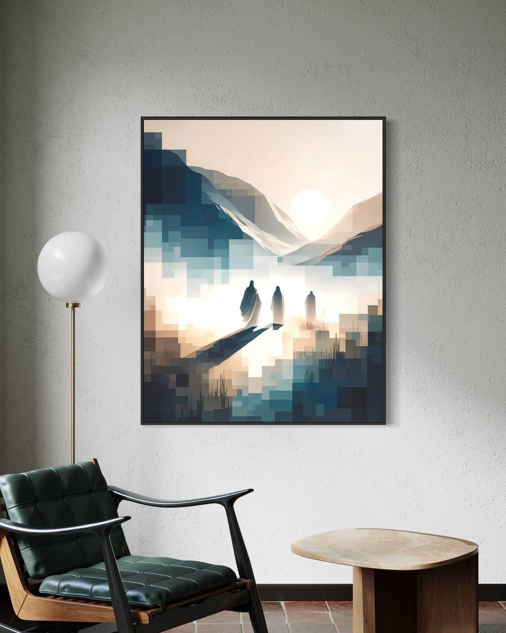 "Jesus e Apóstolos" é uma obra que transcende o simples conceito de arte, levando o observador a uma reflexão profunda sobre a jornada da vida. Através de uma composição habilmente equilibrada entre luz e sombra, o quadro captura Jesus e Apóstolos em peregrinação, envoltas em um cenário de montanhas pixeladas, sugerindo tanto o mistério quanto a clareza da jornada espiritual.