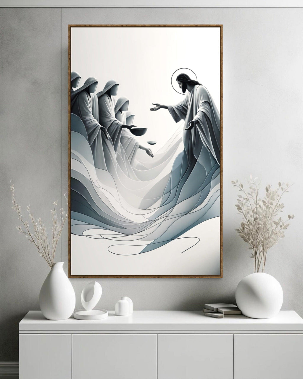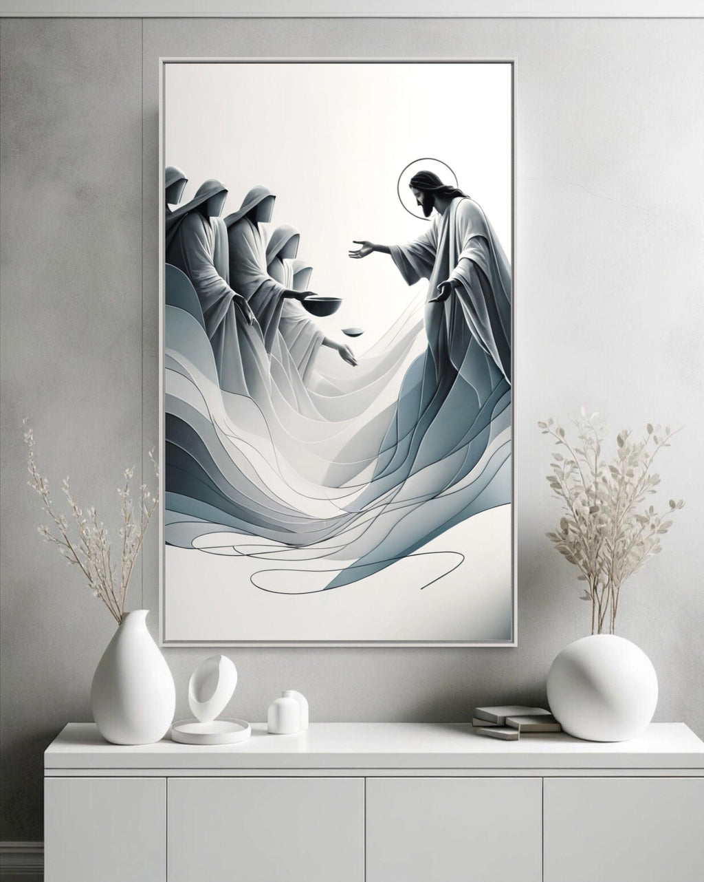 Esta obra é ideal para aqueles que buscam uma representação de fé que se alinha com um estilo contemporâneo e sofisticado. "Jesus Multiplica os Pães" não é apenas uma peça decorativa, mas uma expressão artística de um momento divino, capturada com simplicidade e beleza. A presença central de Jesus e a fluidez das formas ao seu redor criam uma sensação de paz e inspiração, perfeita para ambientes que valorizam tanto a espiritualidade quanto o design moderno.