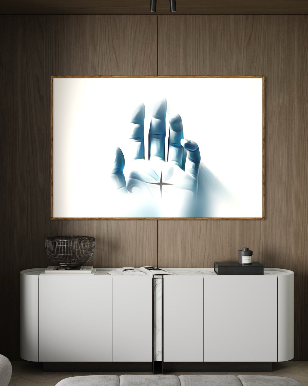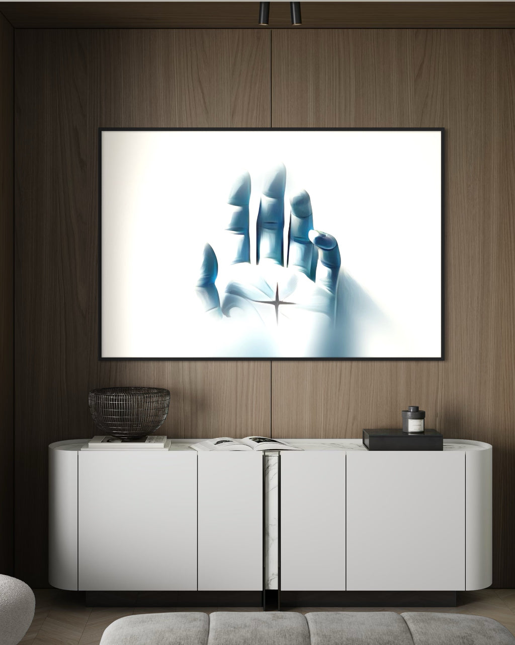 Em Toque Divino, a mão sagrada emerge de uma luz celestial, simbolizando proteção, cura e a presença divina em nossas vidas. Os tons azulados e brancos criam uma sensação de paz e serenidade, enquanto o brilho suave em forma de cruz no centro reforça a conexão espiritual e a fé.