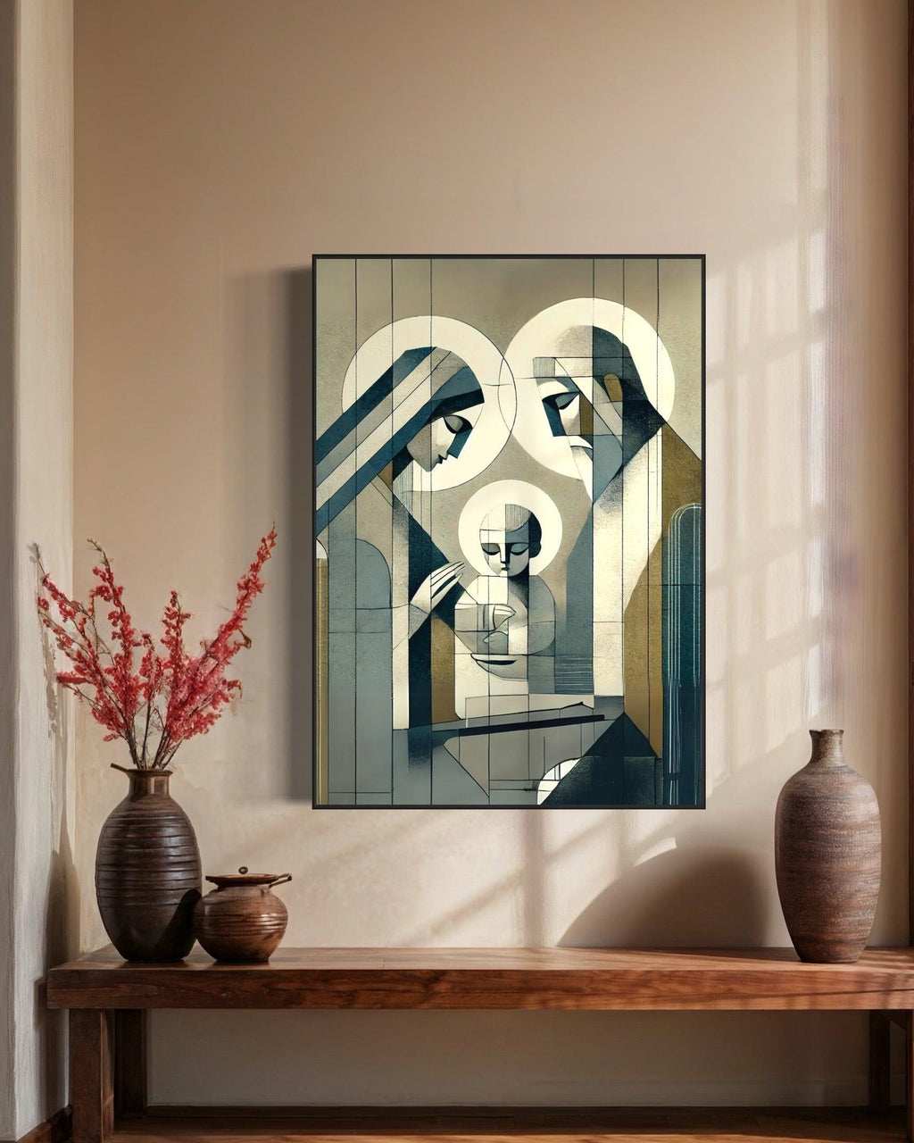 "A Sagrada Família – Abstração Sagrada" é uma obra de arte que reinterpreta a icônica imagem da Sagrada Família através de uma linguagem visual moderna e abstrata. Com linhas geométricas e uma paleta de cores suaves e terrosas, esta peça capta a essência do amor e da união familiar em uma composição que é ao mesmo tempo simples e profundamente simbólica. Os halos que circundam as cabeças de Maria, José e o Menino Jesus são representados de forma estilizada, destacando a sacralidade do momento e trazendo uma aura de paz e serenidade ao ambiente.