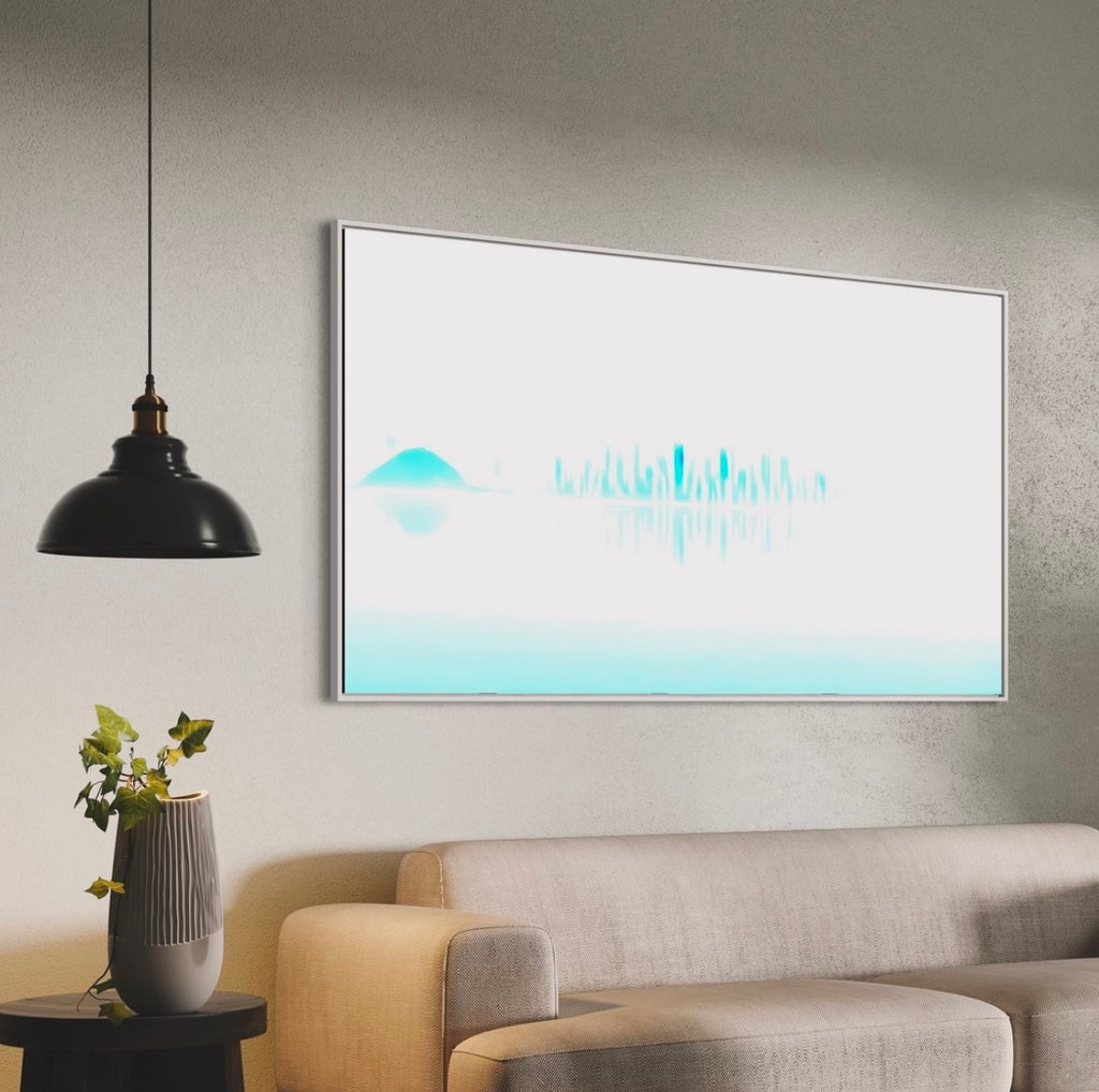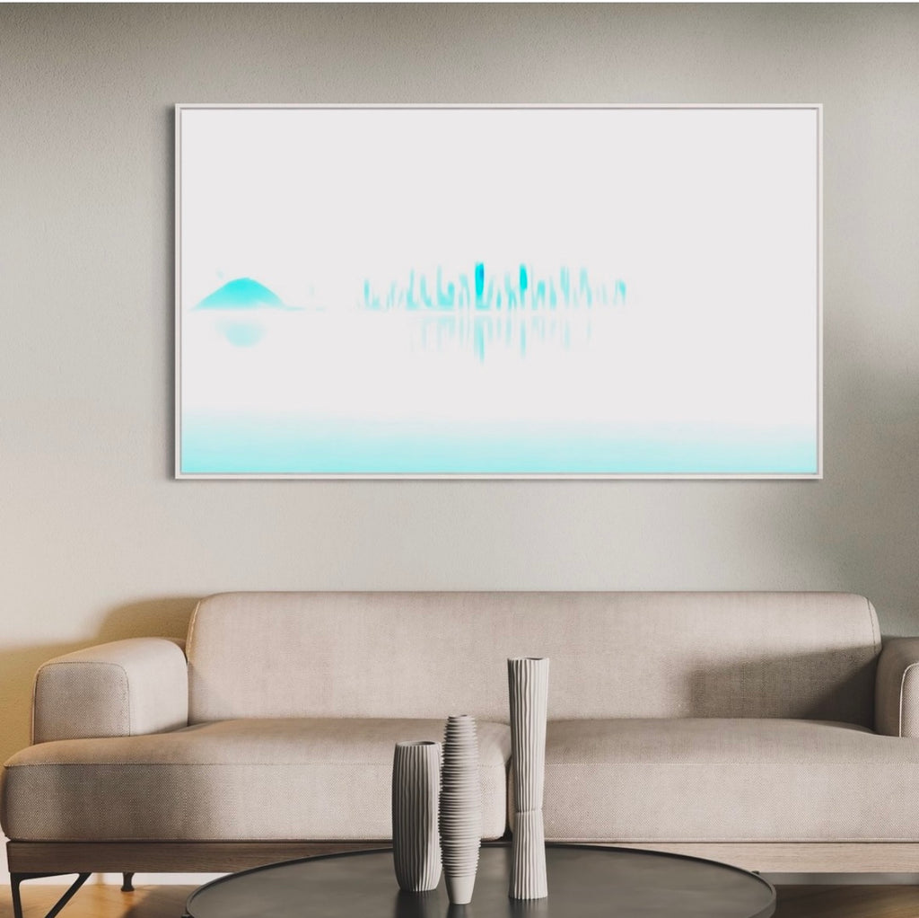 Esta obra de arte abstrata representa a paisagem de Balneário Camboriú de forma estilizada e minimalista. A paleta de cores, composta principalmente por tons pastel de azul e branco, cria uma sensação de leveza e serenidade. As formas geométricas, que evocam a arquitetura da cidade e a ondulação do mar, são cuidadosamente dispostas para equilibrar a composição. A imagem se destaca por sua simplicidade e elegância.